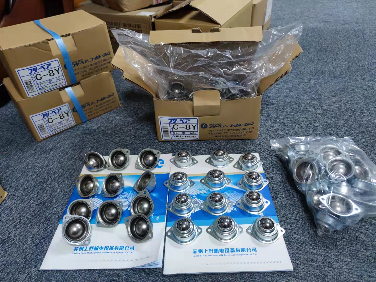 苏州上野 刘燕汽车行业专用 福力百亚FREEBEAR福瑞贝尔共荣滚珠C-8Y,日本株式会社 共栄精工として设立1971年,竣日本FREEBEAR工厂主营制造销售各种运输机械,包括滚珠和浮动导轨,以及自动定位装置,隔震轴承和压缩空气驱动器等等。万向滚珠适用于生产汽车配件,机械、五金、化工、食品、超市、机场、仓库等行业。被广泛地应用于物流、传动工业的机械承载、装配线、输送机、传动机等输送设备,以及物体转弯、合流部分。直线导轨主要用在自动化机械上比较多,像德国进口的机床,折弯机,激光焊接机等等,当然直线导轨和直线轴是配套用的。