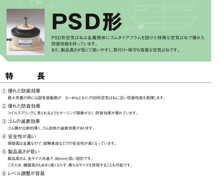 特长:通过在金属筒体上设置橡胶隔膜的特殊空气弹簧,发挥优异的防振性能。最大载荷时,固有频率为3~4 Hz,具有与PSB型空气弹簧相近的防振性能。绝缘螺旋弹簧中出现的冲击现象,隔音效果很好。橡胶膜比较厚,具有橡胶本身的衰减效果。由于侧壁面是金属,所以在接触事故等方面的安全性提高了。产品高度,全尺寸通用,设计低达90 mm。设备高度也不会太高,也可以同时使用不同的尺寸。内部塞子可以支持设备,即使在没有空气的情况下,安装和维护也很容易。