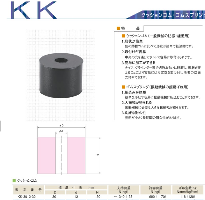 日本Kuraka仓敷化工缓冲橡胶KK-5016-50 ,形状简单,可通过刀、磨床等切断,容易变更弹簧常数。缓冲橡胶)与其他防震橡胶相比形状简单经济。通过中央的孔,可以用螺栓轻松安装。橡胶弹簧)以简单的形状很容易组装到振动机器中。获得振动机械所需的大的振动宽度。发热小,持久性长。
