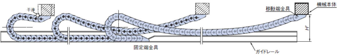 与标准设置时的H尺寸不同。请按照长跨距规格一览表的尺寸设置。此尺寸过高或过低会引起电缆拖链的屈曲或上浮,造成拖链的破损。